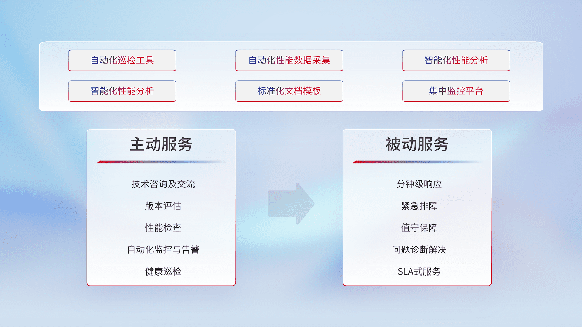 智能化工具和标准化文档,,保障服务质量,,,,提供主动服务(包含技术咨询、、版本评估、、、、性能检查、、、、自动化监控与告警、、、健康巡检)和被动服务包含(分钟级响应、、紧急排障、、、值守保障、、、、问题诊断解决、、、、SLA服务)。。。